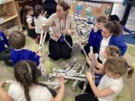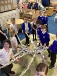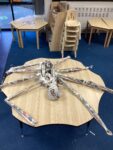 To complete our sculpture focus during our art lesson, we worked together create a 3D sculpture. We created a gigantic spider. We worked together to fold and roll news paper and then attach pieces together to create the legs, arms and body of the spider.