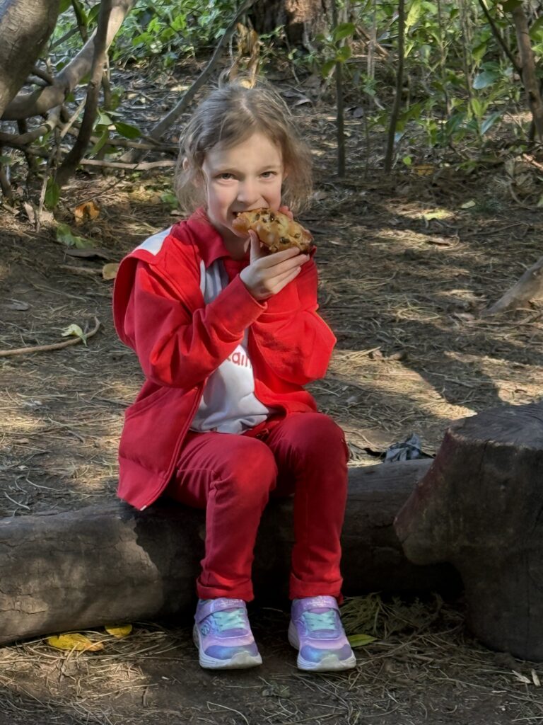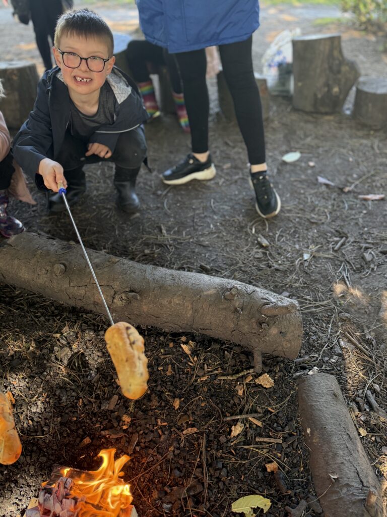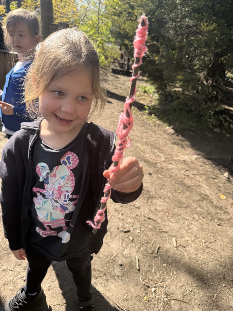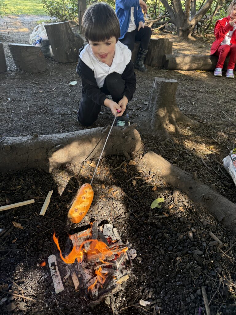 We began around the campfire, where the children enjoyed brioche together while chatting and settling in, developing their speaking and listening skills. They then got creative, making fairy wands and decorating fairy doors using natural materials, showing imagination and staying positive as they worked through their ideas.