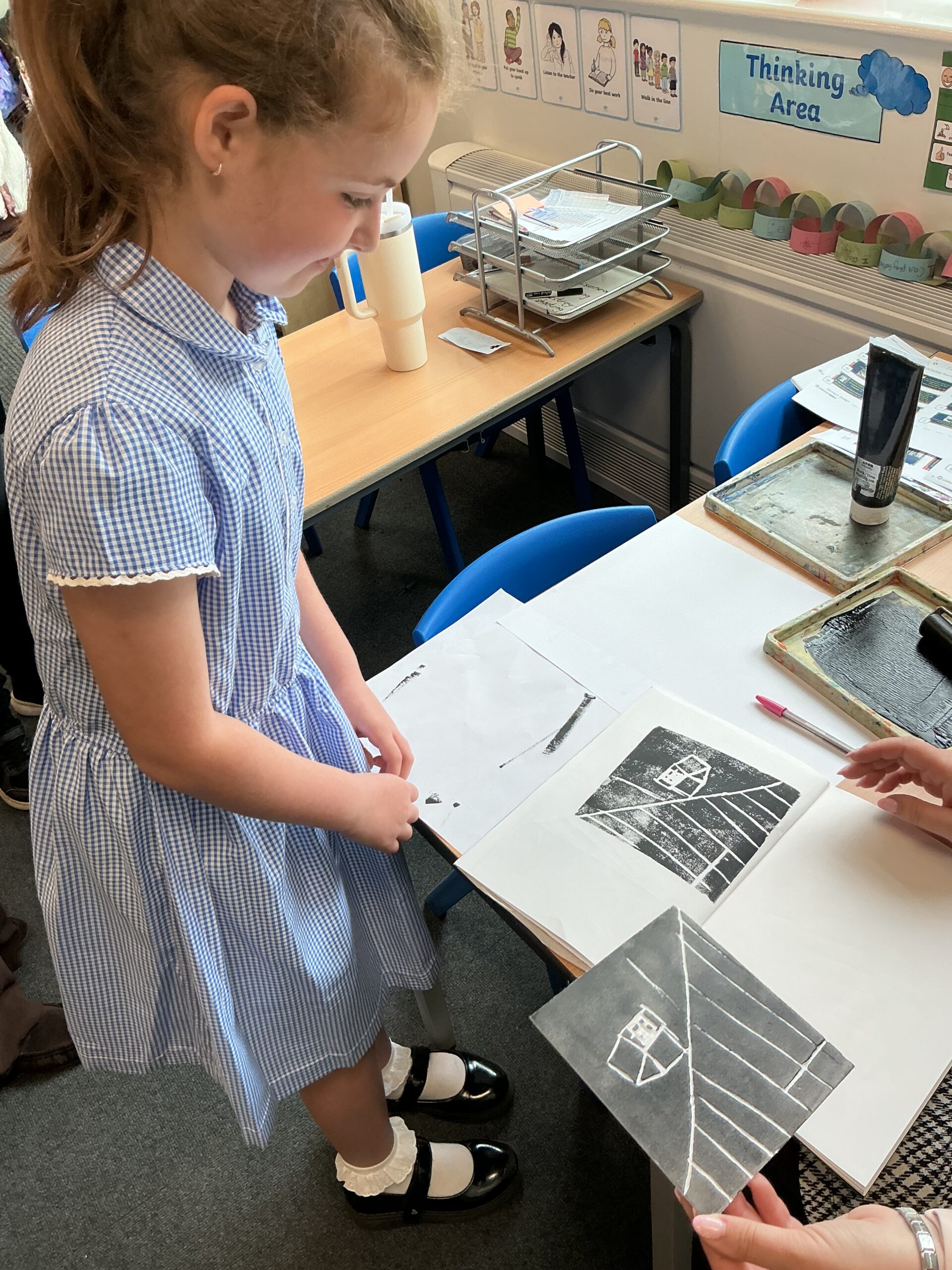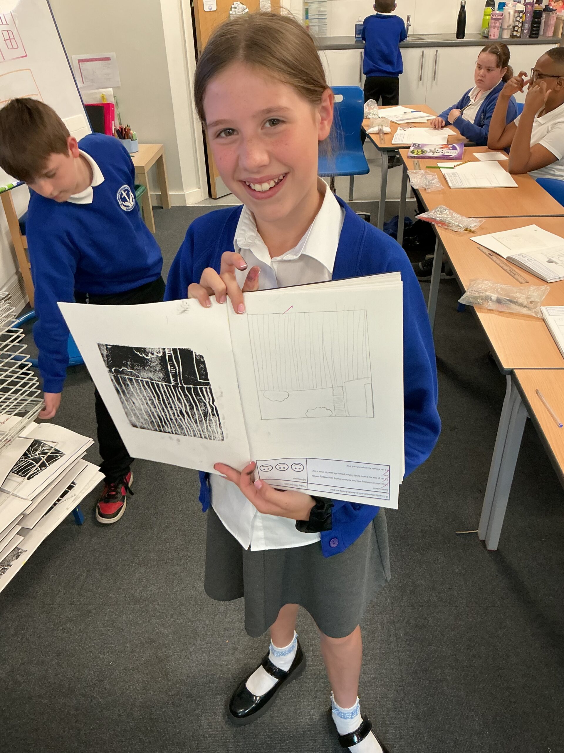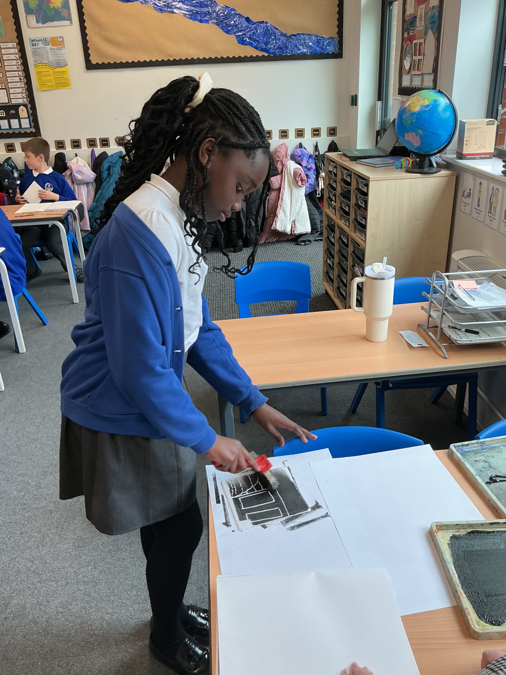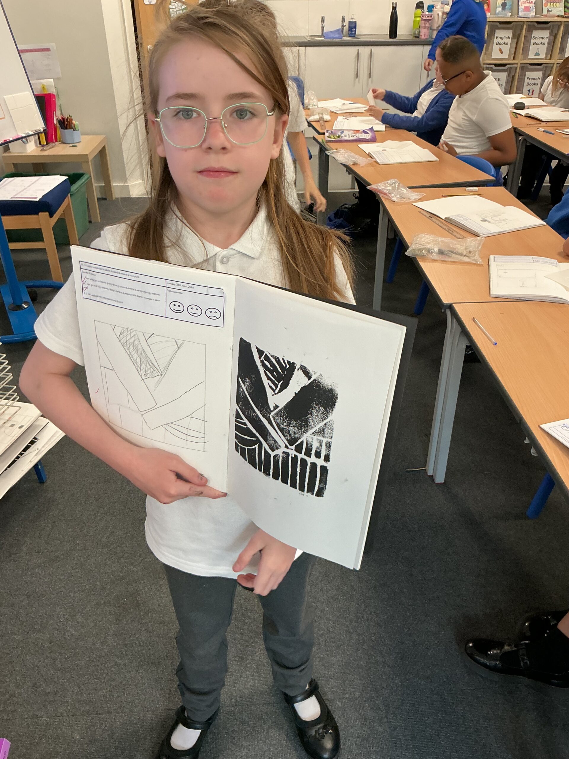 In our art topic this half term, year 5 are looking at craft and design, specifically architecture. We have looked at houses and buildings so far and have even made our own drawings of houses. Today, we selected a small area of our drawing from last lesson as if we had ‘zoomed in’ and copied this section larger. We then imprinted this onto polystyrene and used printing ink to print our design. The designs worked really well and the children were really impressed with their work! Well done, Juniper!