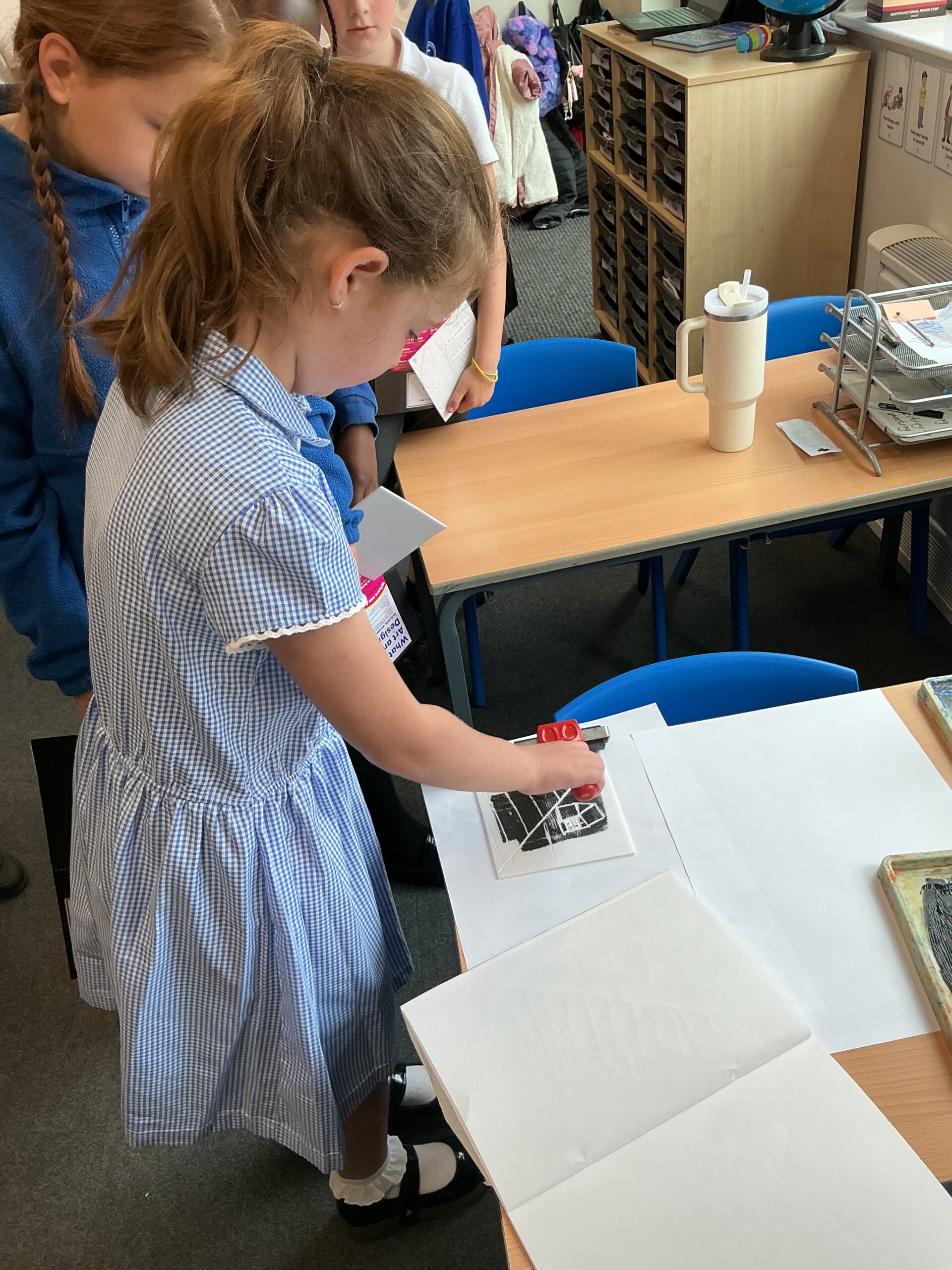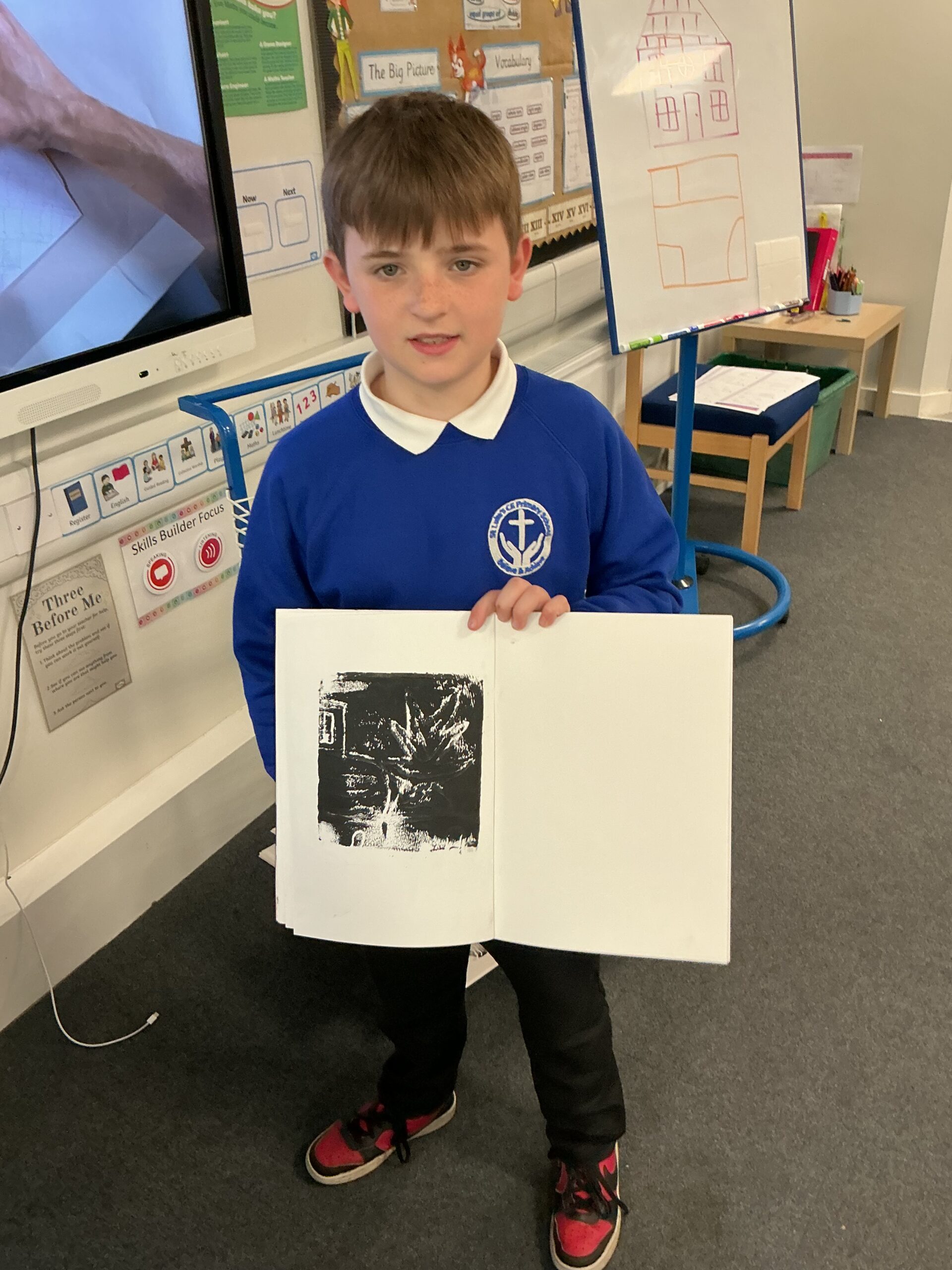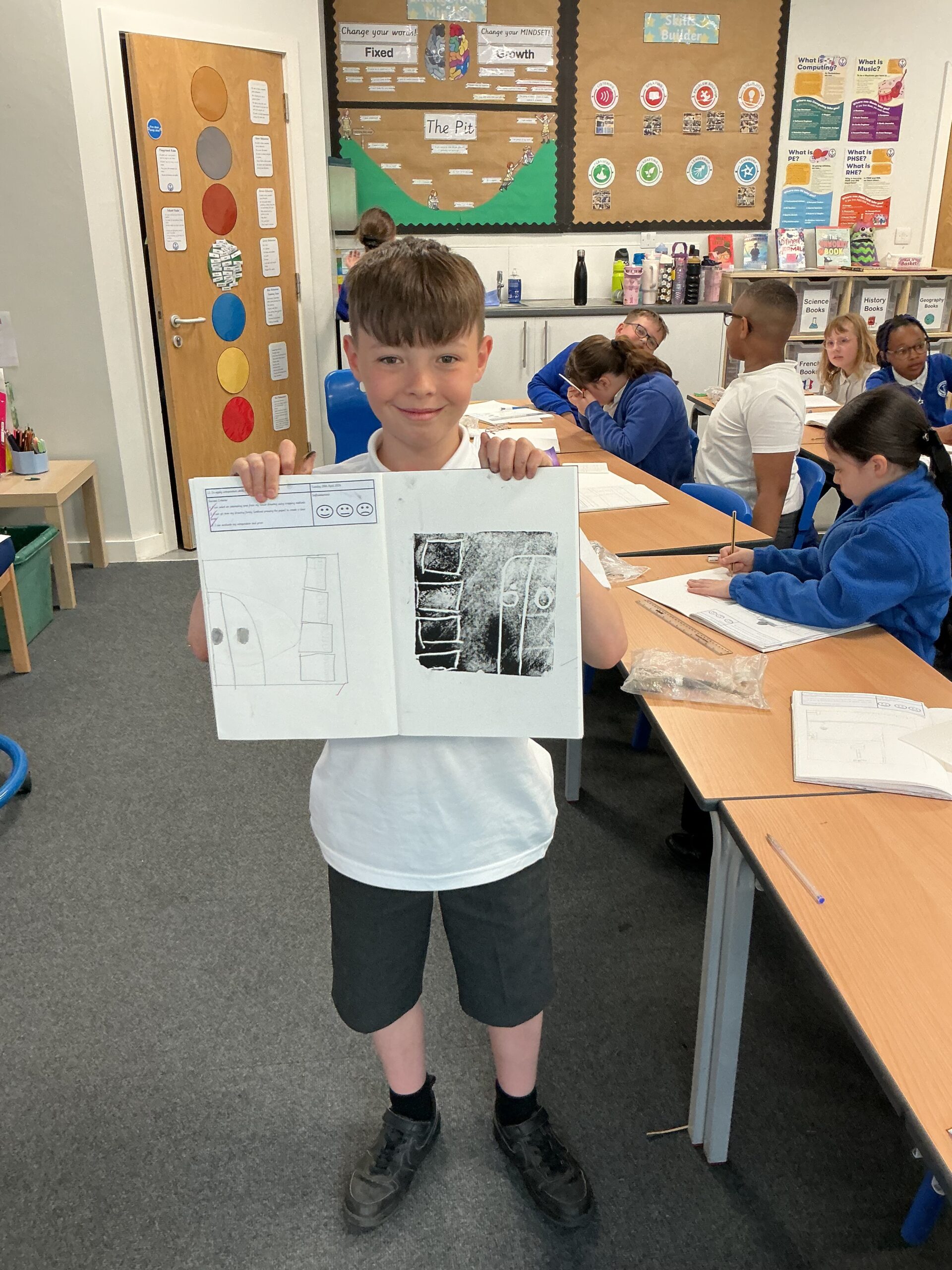 In our art topic this half term, year 5 are looking at craft and design, specifically architecture. We have looked at houses and buildings so far and have even made our own drawings of houses. Today, we selected a small area of our drawing from last lesson as if we had ‘zoomed in’ and copied this section larger. We then imprinted this onto polystyrene and used printing ink to print our design. The designs worked really well and the children were really impressed with their work! Well done, Juniper!
