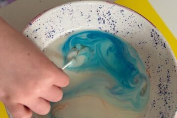 - Combine the vinegar, water, dish soap and 2 drops of food colouring into the empty soda bottle.