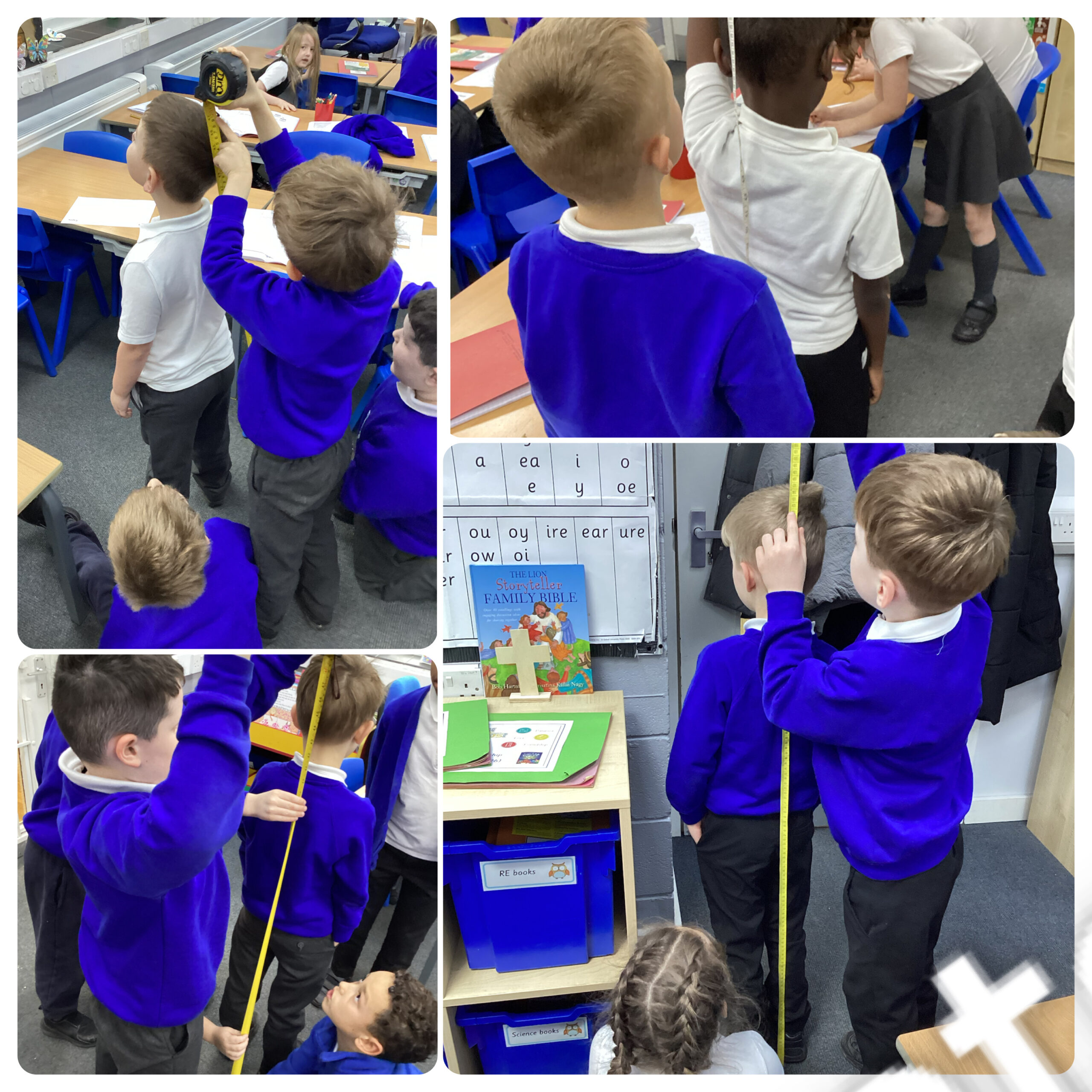 First, we looked at a tape measure and carefully extended it so we could see how long it was. We looked closely at the markings on the tape measure and talked about what they meant. We discussed that the numbers showed measurements in centimetres and that these measurements helped us find out how tall someone was.