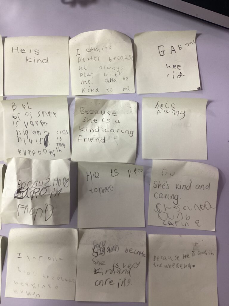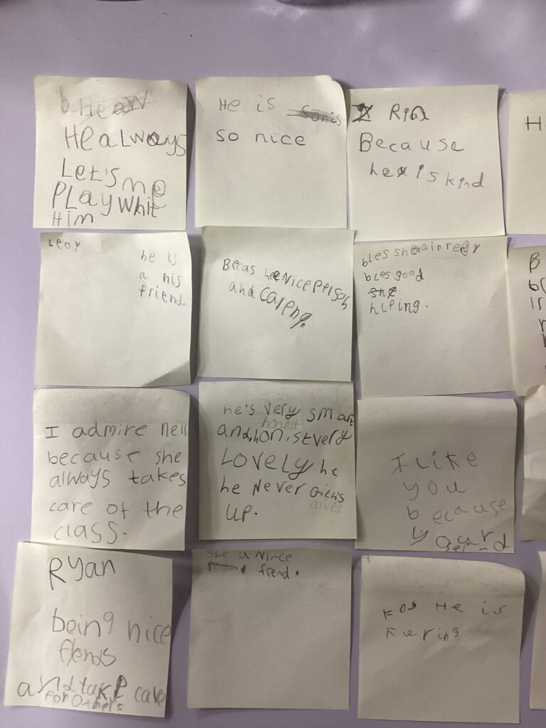 We also carried out a very special activity to help children recognise strengths in others. In a calm and safe space, each child chose a classmate’s name and wrote it on a post-it note. On the back, they wrote something they admired about that person. We reminded the children to focus on positive qualities such as always trying their best, being kind, never giving up or being a good friend. We had some amazing ideas, and it was lovely to see how thoughtfully the children recognised and celebrated each other’s strengths.