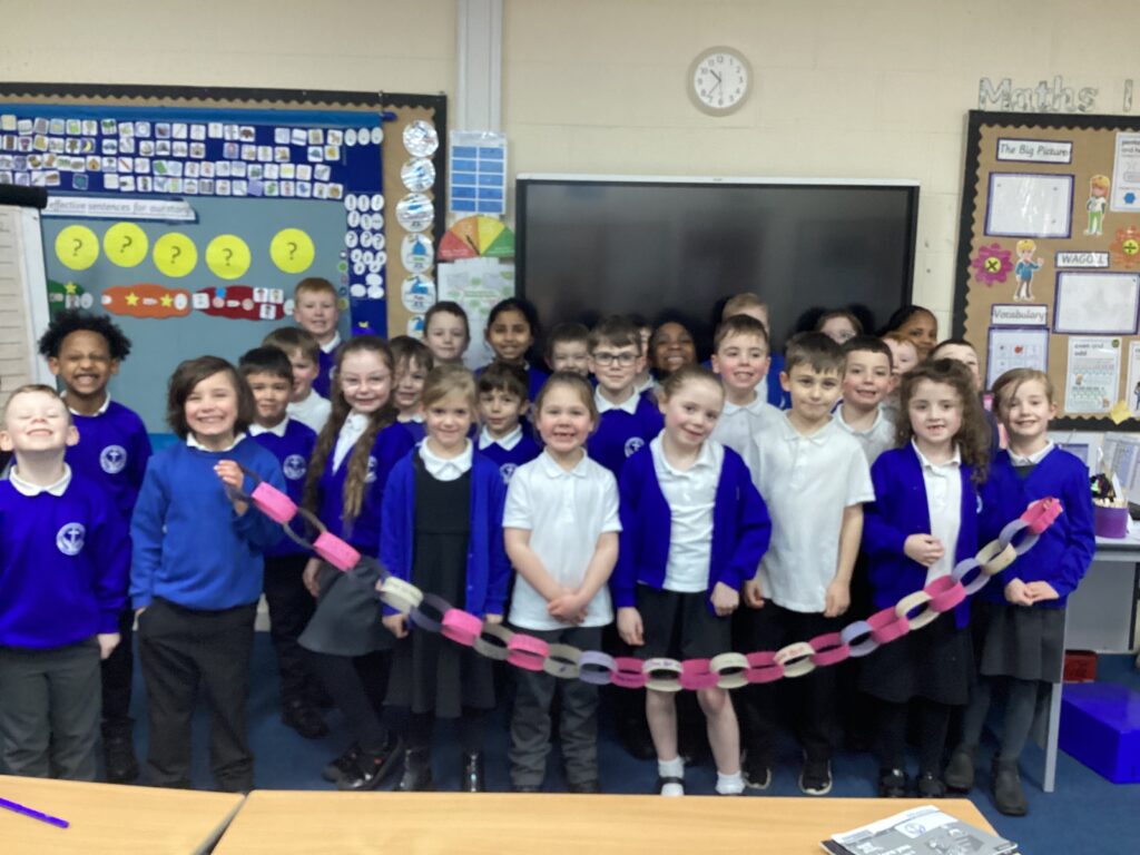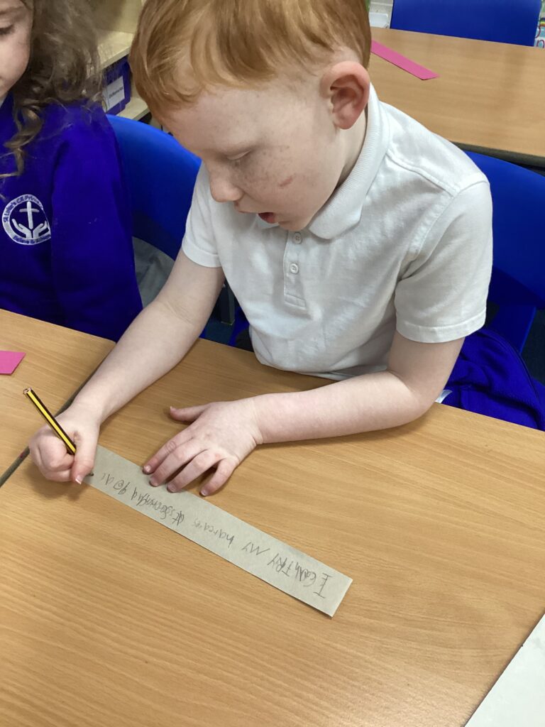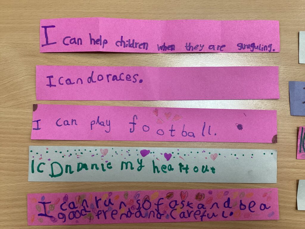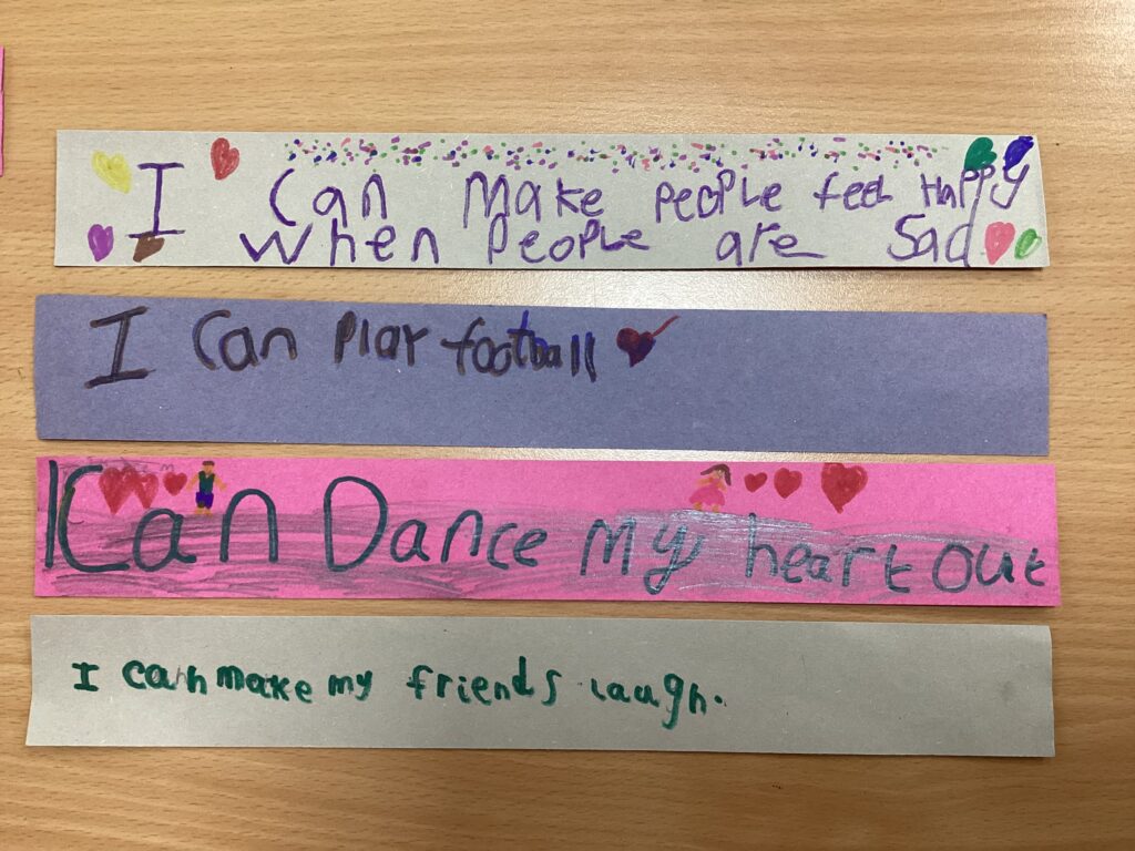 Each child completed an “I can…” activity, where they drew or wrote about something they enjoy or a skill they are proud of. We talked about how this does not have to mean being the best at something, but about enjoying learning, using our skills and persevering when things feel tricky. These were brought together to create a “I can…” classroom paperchain, showing all the wonderful strengths in our class.